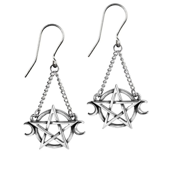 A delicate pair of pewter dropper earrings depicting a pentagram with small crescent moons either side, suspended from fine chain. …