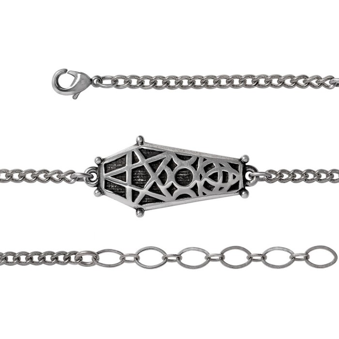 A shining, tangible spell of protection, defying the reaper and his dark spirts of mortality by the incessant tangle of positively baneful symbology. Step into a world where darkness meets elegance with our stunning Hex Coffin Wrist Chain. This captivating piece of jewellery is designed for those who dare to express their individuality. Crafted from antiqued pewter, its shimmering finish beautifully highlights intricate details, making it a must-have accessory for mystical souls and lovers of the macabre. Embrace the symbols of power and protection with the enchanting triple moon and pentagram designs etched into the coffin-inspired silhouette.