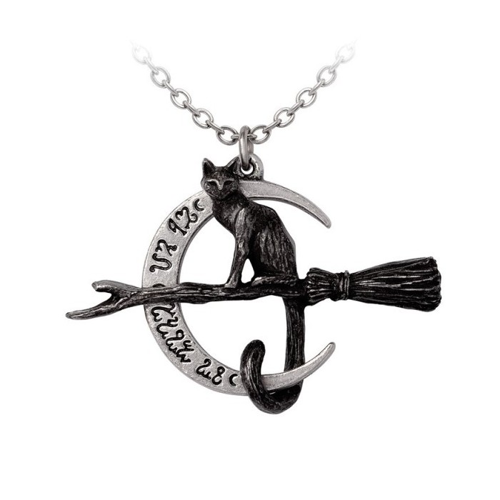 Ride beneath the moonlight with the Regina Covenorum Necklace, a spellbinding design that celebrates the mystery and magic of the witch’s familiar. Handcrafted in fine English pewter, this enchanting piece features a black cat soaring upon a broomstick, framed by a polished pewter crescent moon engraved with arcane magical symbols. …