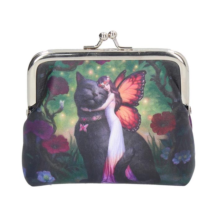 Exclusively to Nemesis Now, this coin Purse comes from the wild untamed imagination of the world-famous Fantasy artist James Ryman. Standing in a secluded garden, hidden by foliage and framed by flowers, this Fairy is barefoot and wears a long white dress with a flower crown. Their chestnut hair falls over their shoulders, and from their back their orange and black butterfly wings are relaxed. They’re hugging a black cat lovingly, which in turn nuzzles them as it curls its tail around them. Behind them, Fairy lights sparkle amongst the bushes. This stylish and durable Purse is held firmly shut with a metal clasp, ensuring the contents are kept secure. Perfect for those who value both enchantment and security.