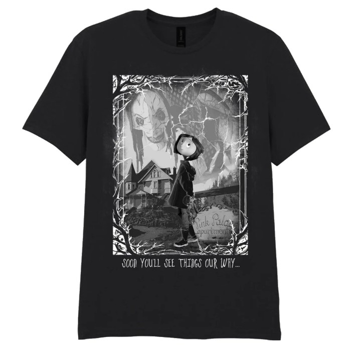 Officially Licensed Coraline merchandise. This T-Shirt features an iconic design from Coraline, printed on a 100% Cotton Black T-Shirt. 30% degrees wash.