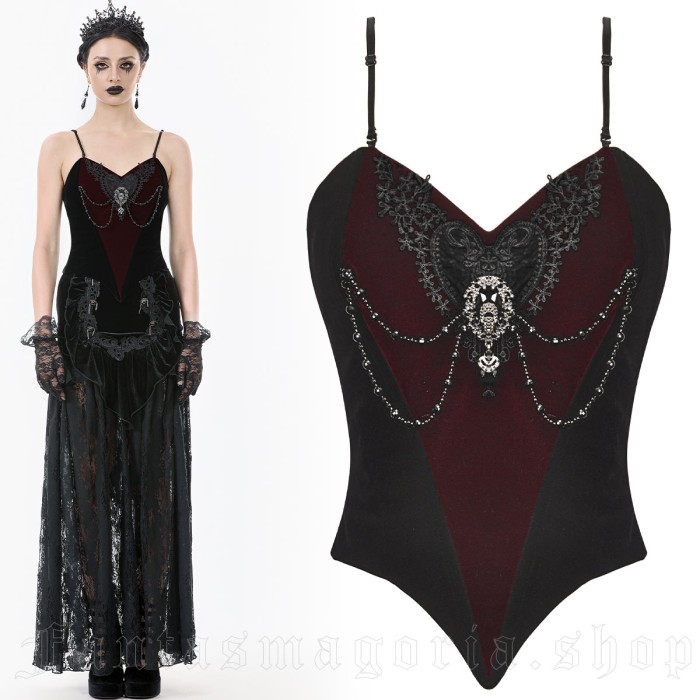 Victoriana – women’s Gothic black and red velvet corset top with V neckline, embroidery, applique lace, hanging beaded strings, and sparkly brooch motif