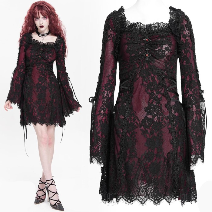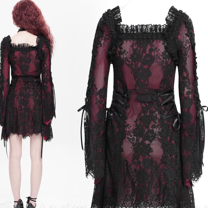 Lace Maiden – Romantic Gothic black red lace short dress with flared sleeves