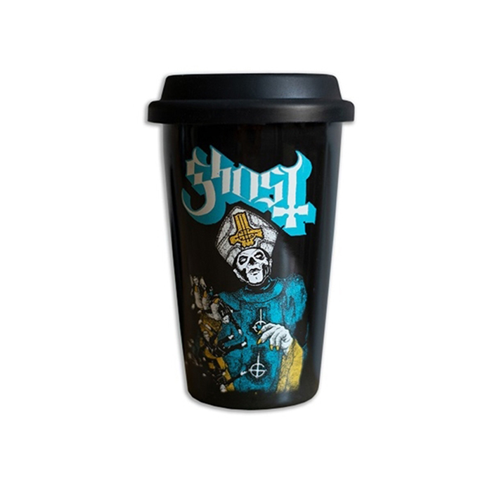 GHOST official licensed travel mug , featuring Papa Emeritus figure. This is a 100% fine ceramic , double wall travel mug with 300ml liquid capacity.