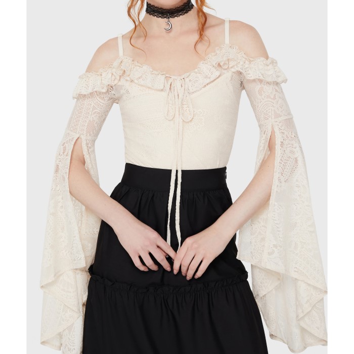 – Off the shoulder style with ruffle along neckline.