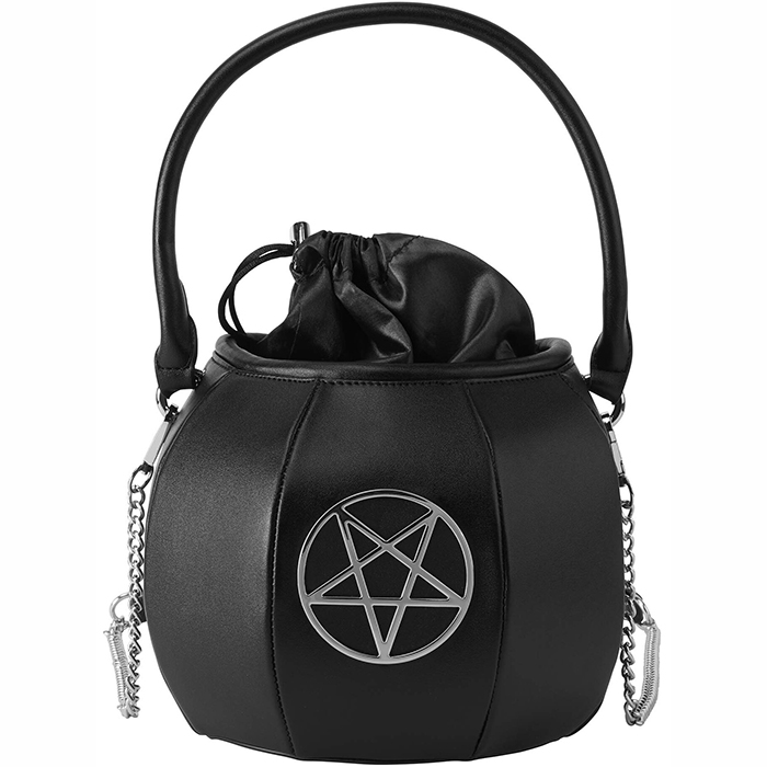 A witch don’t need to do anything – they just are. Summon some magic when leaving your crypt with the ‘Cauldron’ handbag; in a faux-leather body with contrasting silver pentagram hardware to the front, satin pouch closure, and a long chain shoulder strap. Fully lined. Fits yer essentials whilst still keepin’ it light.