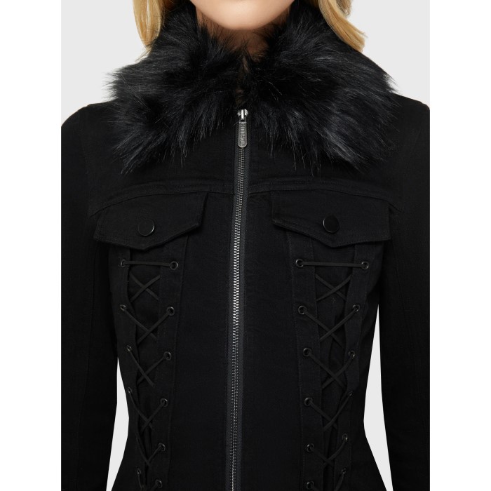 – Statement stretch denim jacket with detachable faux fur collar and cuffs.