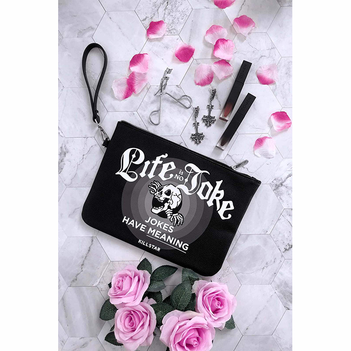 Are you a ghoul that just likes the essentials – or – is your entire crypt a makeup haven? Regardless, feast your eyes on this super cute ‘Life Is No Joke’ makeup bag – ideal for traveling or storing yer fav must-haves. A high-grade faux leather body with zip closure and inside pocket, bold contrast motif on the front and handy wrist strap [detachable].