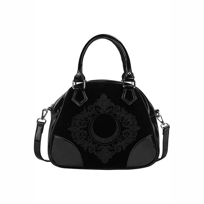 In the shadows, the gate to the underworld dwell – a mystical dimension only a select few can tell. The ‘Luna Lace’ handbag enchants with its lush velvet body – accented with gloss leather, black-on-black statement embroidery, zip closure with side + inside pocket and classic lining. Complete with detachable shoulder straps. Fits all your essentials whilst keeping it light, oh my goth!