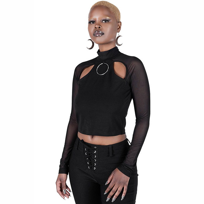 The ‘Mystia’ top is a seductively flattering fitted top with light-weight mesh long sleeves, high neck, cut-out details to the chest and O-ring. In the softest-touch jersey – mixing comfort with some killer looks!