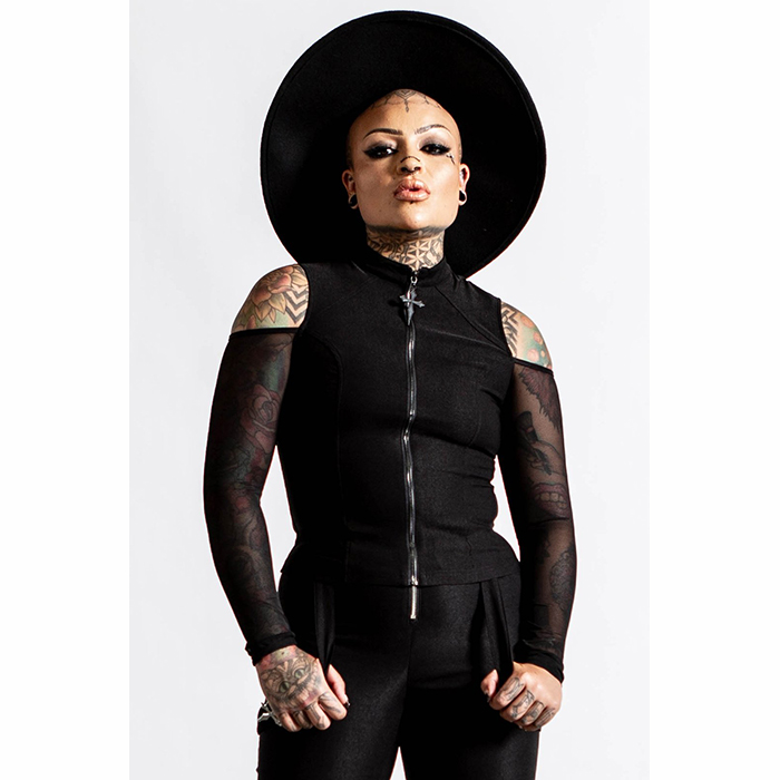 The ‘Scarah’ long sleeve top is a seductively flattering fitted top with light-weight mesh sleeves, high neck, cold shoulders and statement zip to the front with hardware cross. In the softest-touch fabric – mixing comfort with some killer looks!