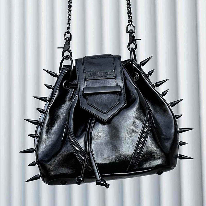 Never let your fear decide your fate – the ‘Tyla Terror’ handbag is a serious must-have! Superior grade faux-leather, stand-out pentagram + spike hardware, long chain strap, and contrast lining. A perfect size so you can fit yer must-have’s, but small enough to be effortless! Purrfect from Dusk to Dawn!