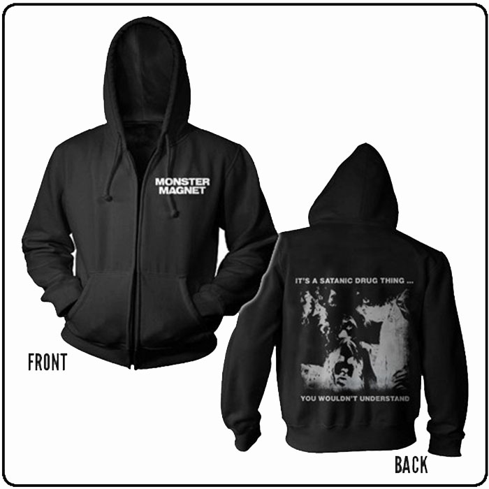 MONSTER MAGNET official licensed zip hooded sweatshirt with pocket on the front , entitled “SATANIC DRUG”. This is a 50% cotton – 50% polyester fine hooded sweatshirt with high quality printing on the front and the back.