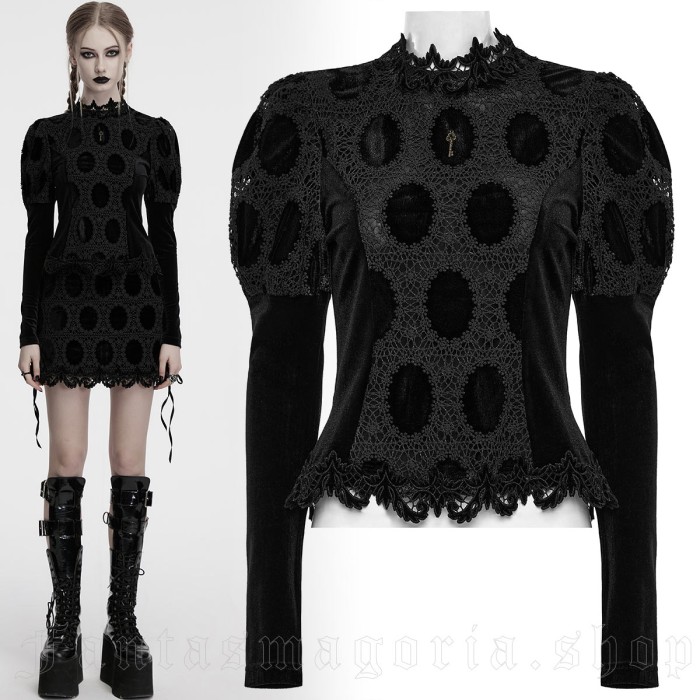Baroque Babe – women’s Romantic Gothic black velvet top with crochet style lace and long Juliet-style sleeves