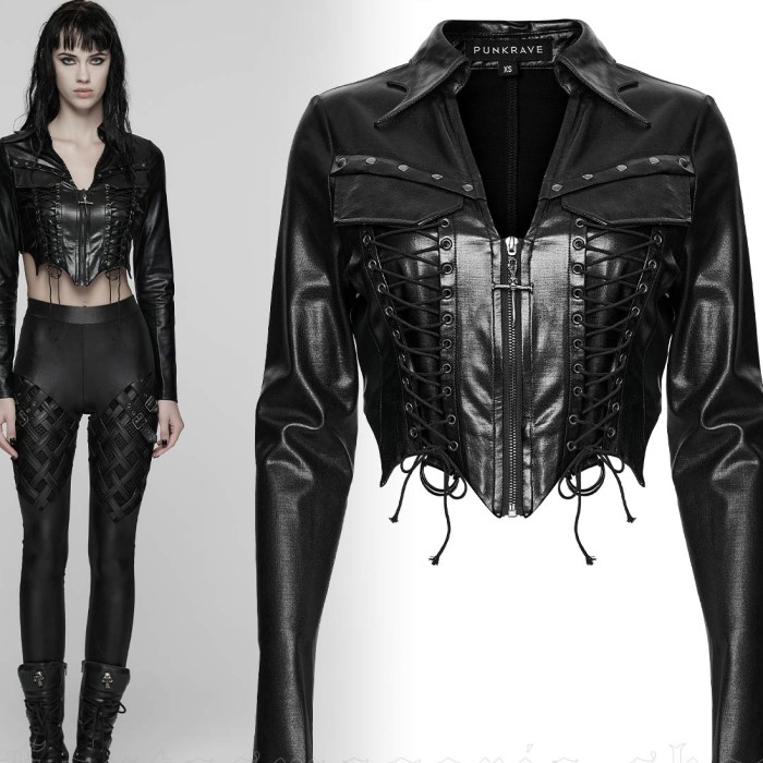Electra – women’s dark punk black leather look long-sleeve cropped zip-up top with lace-up details