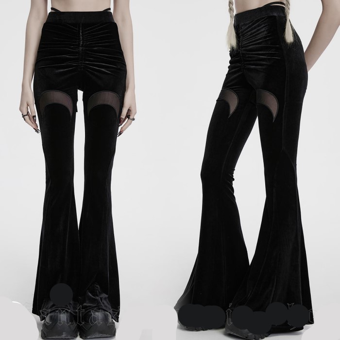 Lunar Spells – women’s Gothic black velvet bell-bottom trousers with crescent moon detail on the thights