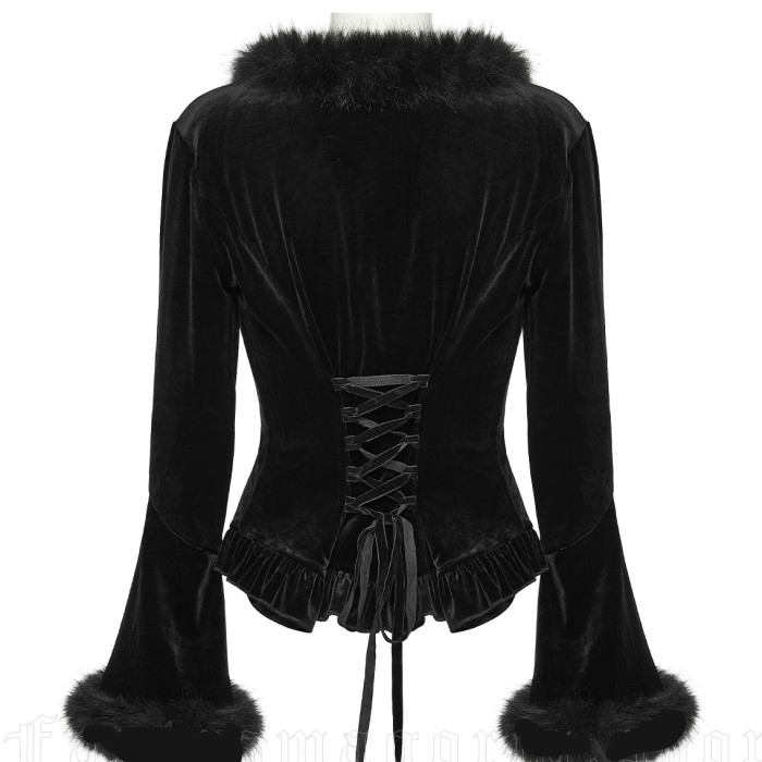 Miss Fur Fur – women’s Gothic black velvet long flared sleeve top with deep V neck and faux fur trims