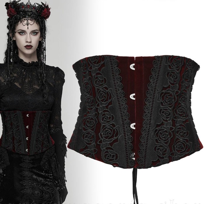 Rose Rouge – women’s Gothic red velvet corset belt with rose embroidery applique