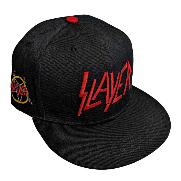SLAYER official licensed black snapback cap, featuring a patch logo to the right side,an embroidered logo on the front and a red cap button.. This is a high quality cotton unisex hat, with an adjustable plastic snap-back fitting to fit most adults.