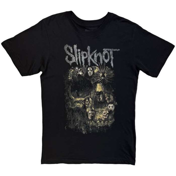 An officially licensed Slipknot T-shirt featuring the Skull Group design motif. Manufactured from soft-style cotton, this unisex short-sleeve tee is finished in a black colourway. The design is printed on both the front and back and supplied bagged for retail distribution.