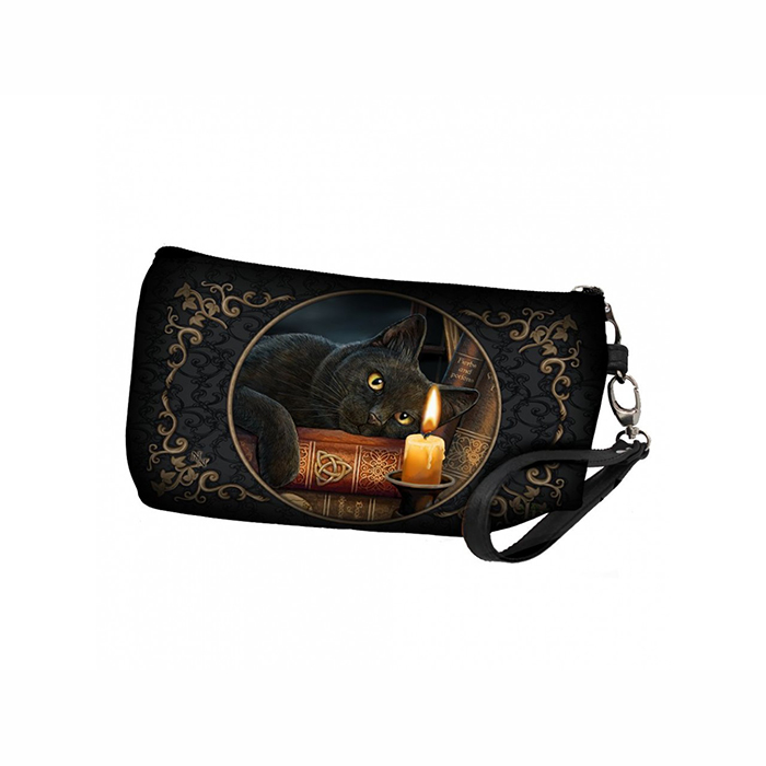 From the imagination of globally renowned fantasy and wildlife artist Lisa Parker, this washbag. Resting on some leather-bound occult books on top of a section of wooden table, this black cat reclines, tail curled up inquisitively as it looks up at you. A curled scroll lies on the table next to a candlestick, almost burnt down to the nub, the flickering flame burning merrily. Lisa Parker’s imagination brings this piece to life, giving any space the air of mystical study. The perfect size for all your toiletries, this washbag is fantastic for taking to your witch’s apprenticeship.